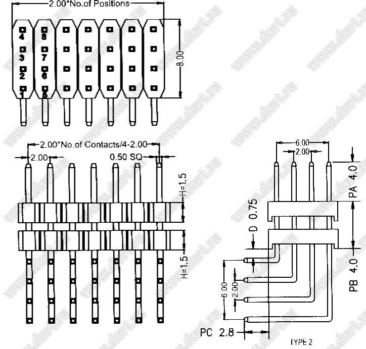 Вилки штыревые четырехрядные угловые с двойным изолятором угловые (шаг 2,0x2,0 мм), тип R2