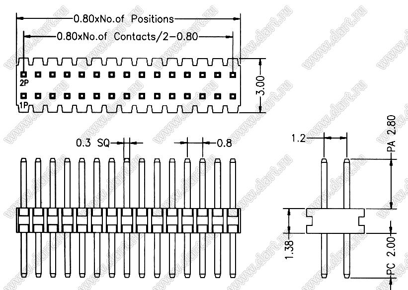 вилки штыревые открытые прямые двухрядные на плату для монтажа в отверстия, шаг 0,80 x 1,20 мм