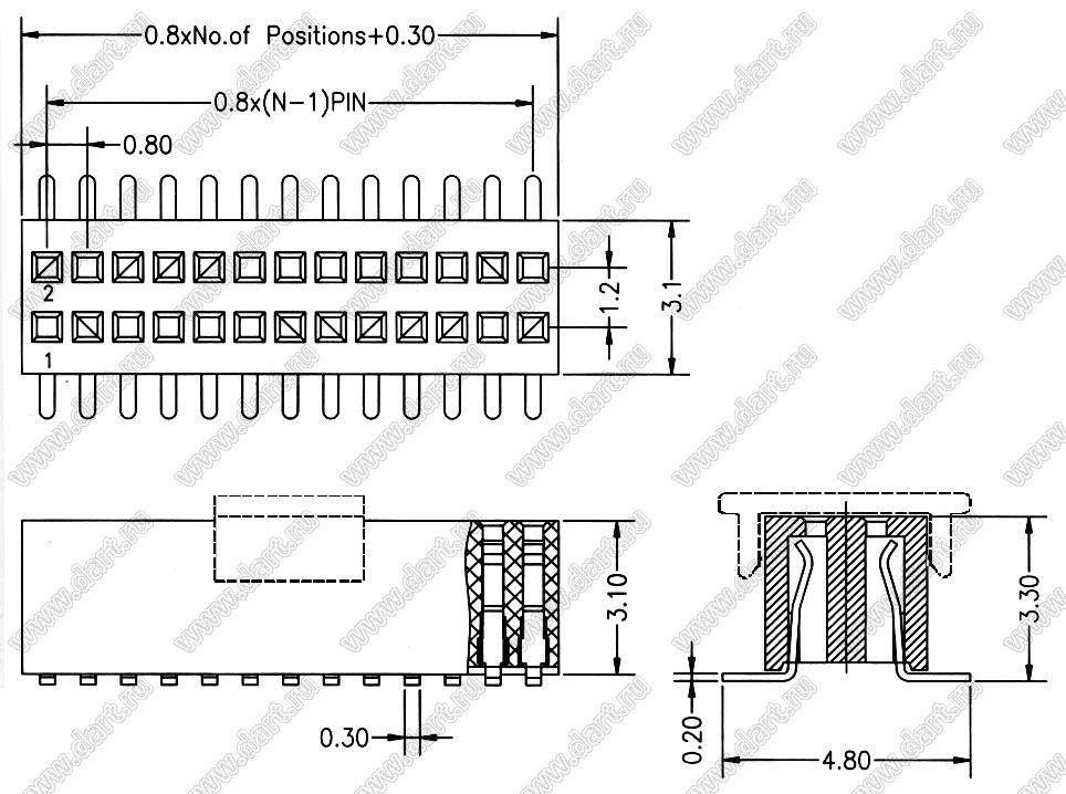 розетки прямые двухрядные на плату с монтажной крышкой для автоматического поверхностного (SMD) монтажа, шаг 0,80 x 1,20 мм