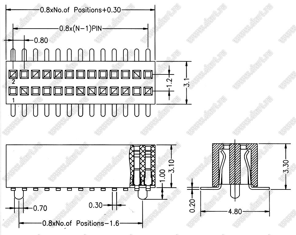 розетки прямые двухрядные на плату для поверхностного (SMD) монтажа с направляющими, шаг 0,80 x 1,20 мм