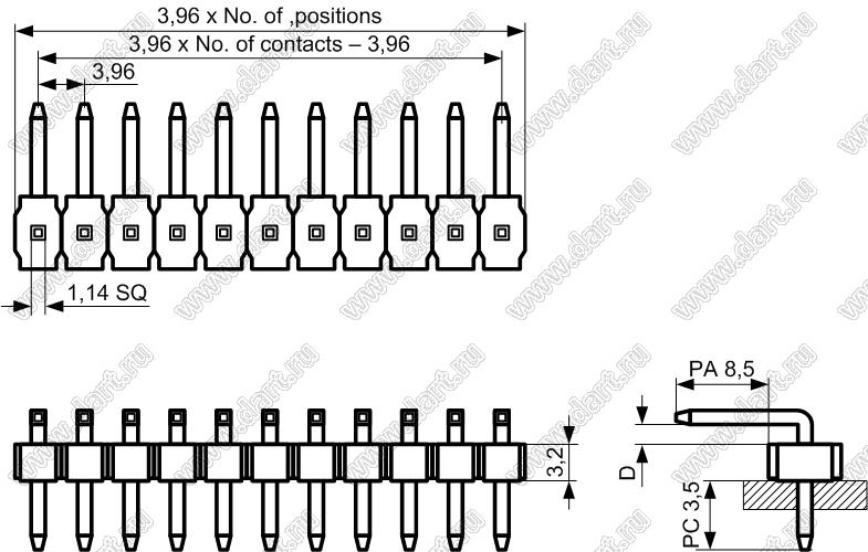 вилки однорядные угловые, шаг 3,96 мм