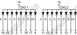 Каталог > Оптоэлектроника и индикация > Индикаторы светодиодные (сегментные дисплеи, матрицы, шкалы, светящиеся поля) > Цифровые и цифро-буквенные cветодиодные сегментные индикаторы (дисплеи) > 2-разрядные сегментные индикаторы > 2-разр. 0.52 дюйм. 7-сегм. 5221 серия > BJ5221BE