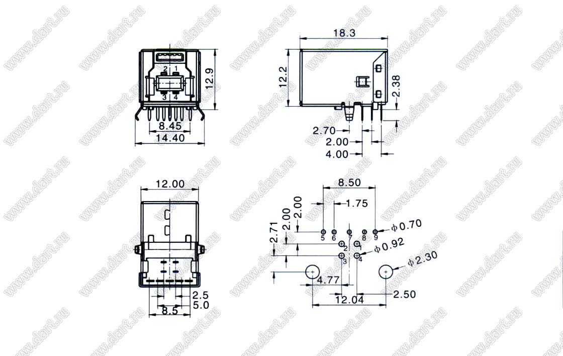 Розетка USB3.0 на плату для выводного монтажа угловая тип B
