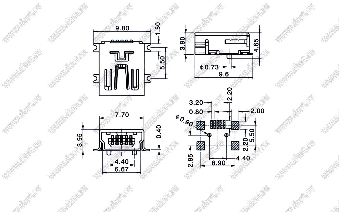 Розетка мини USB2.0 для поверхностного (SMD) монтажа, 5 конт.,(0.4)