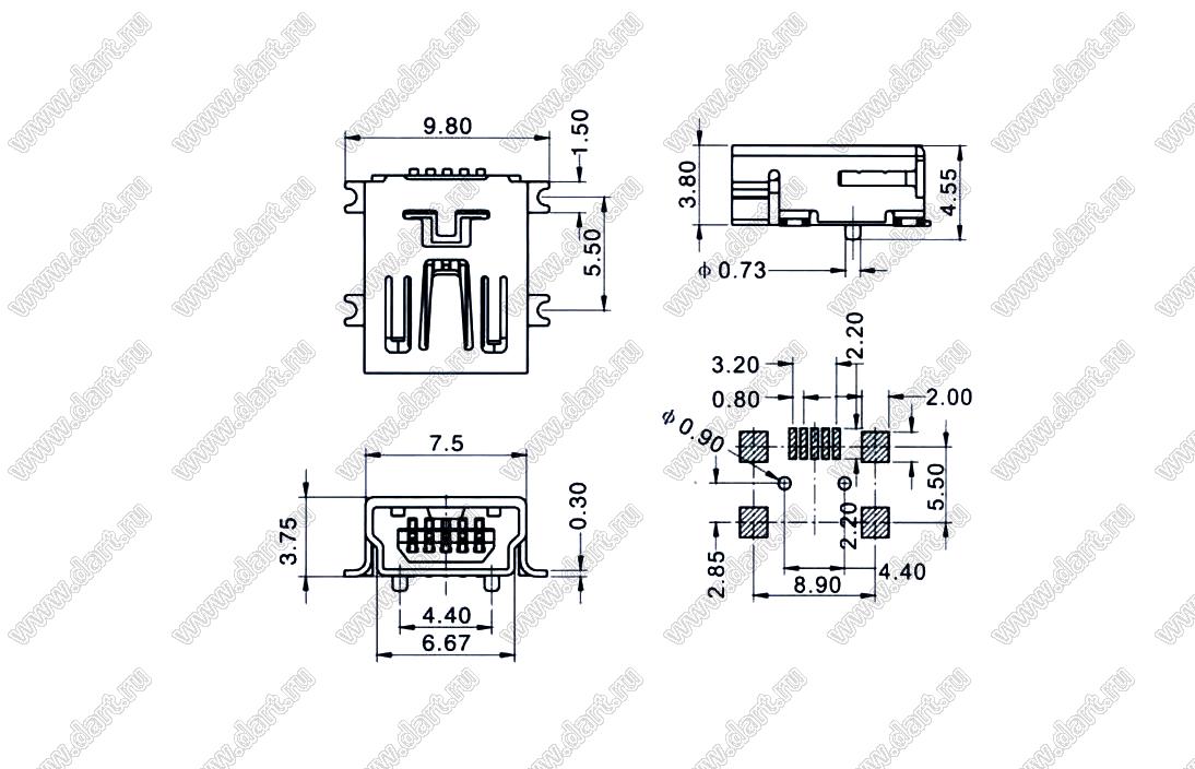 US01-304 розетка мини USB2.0 для поверхностного (SMD) монтажа, 5 конт.,(0.3)