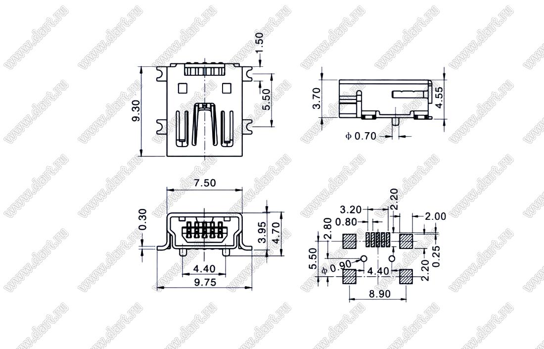 US01-451 розетка мини USB2.0 для поверхностного (SMD) монтажа, 5 конт.,(0.3)   US01-451