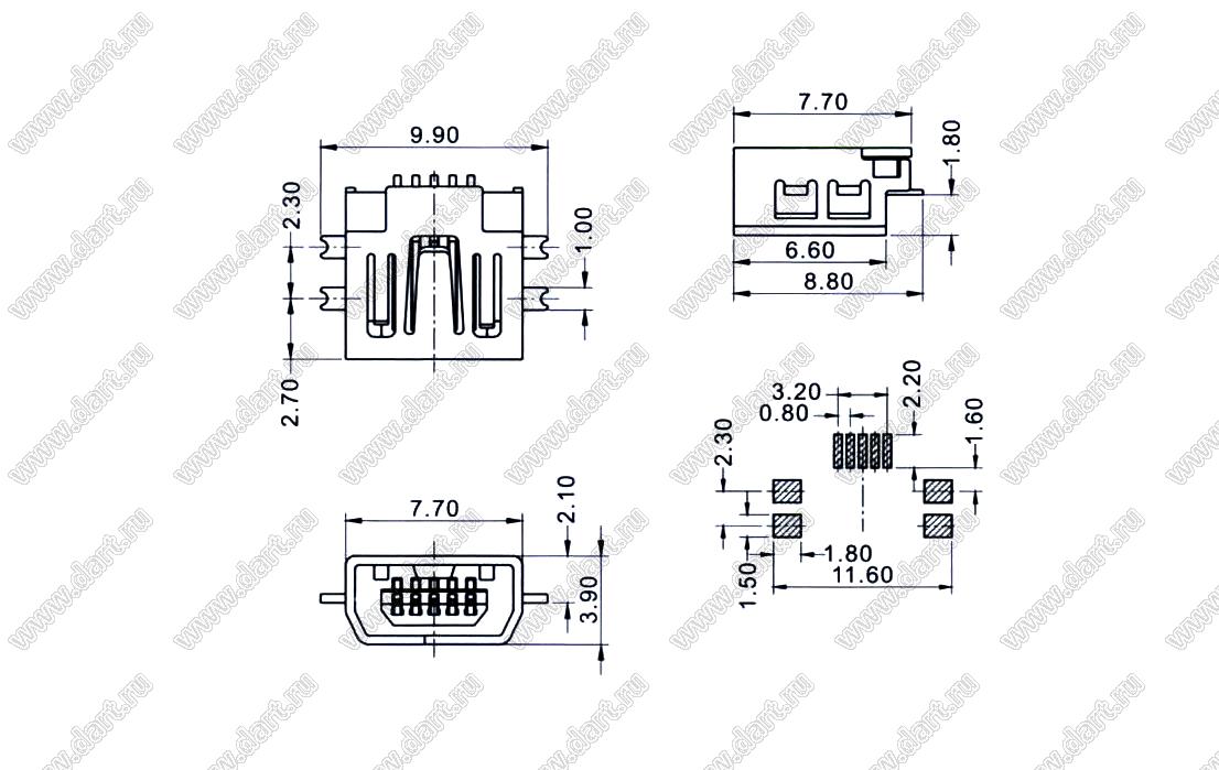 Розетка мини USB2.0 для поверхностного (SMD) монтажа, тип AB, 5 конт.