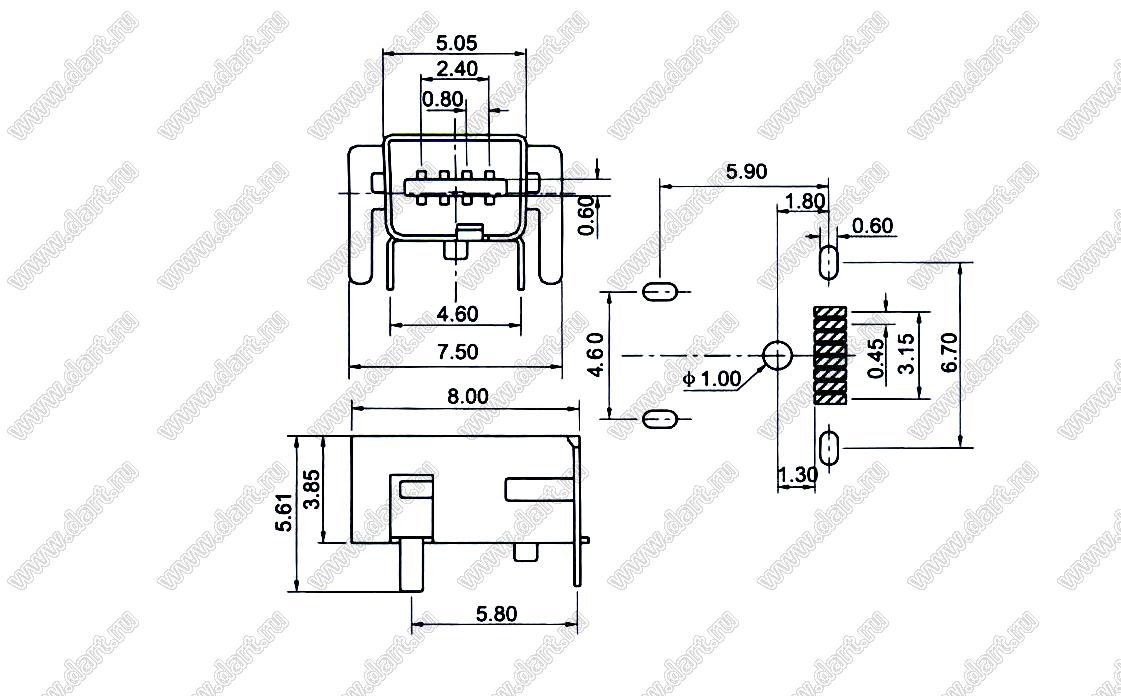 Розетка мини USB2.0 для поверхностного (SMD) монтажа, 8 конт.