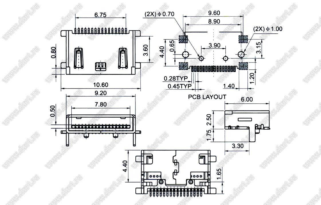 Розетка мини USB2.0 для поверхностного (SMD) монтажа, 16 конт.