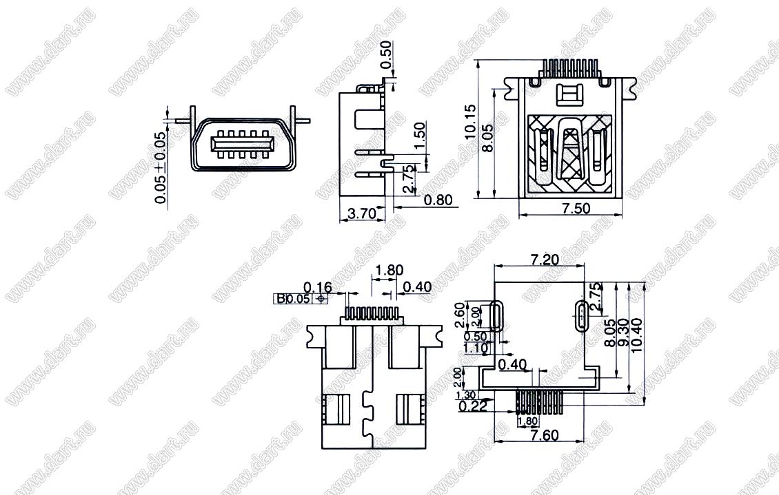 Розетка мини USB2.0 для поверхностного (SMD) монтажа, 10 конт.