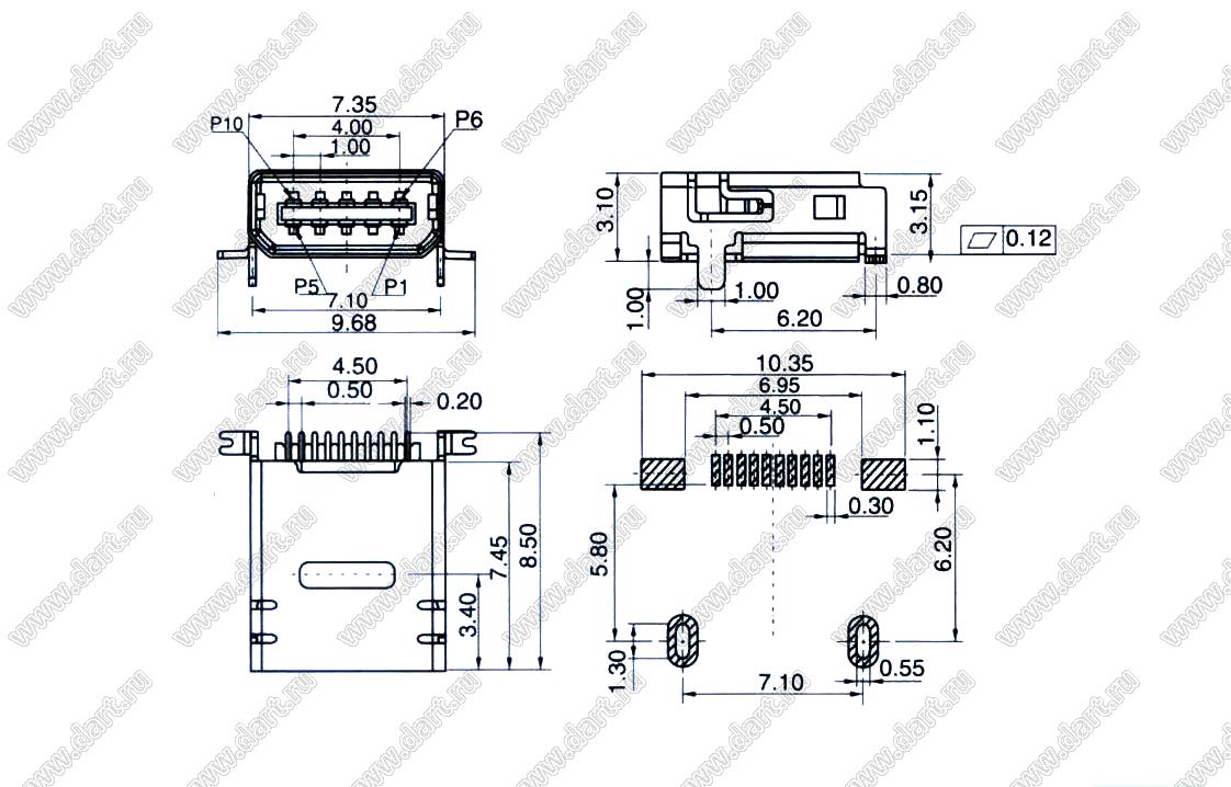 Розетка мини USB2.0 для поверхностного (SMD) монтажа, 10 конт.