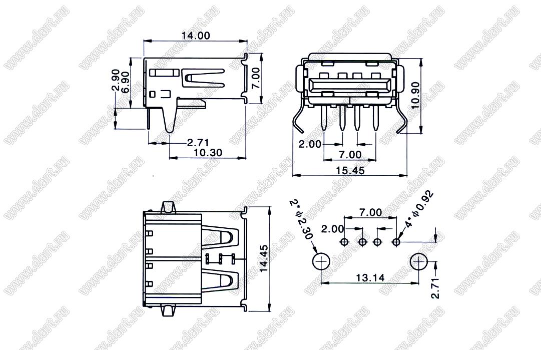 Каталог > Электронные компоненты, радиодетали > Разъёмы (соединители, переходники) > Разъемы USB > Разъемы USB-A > Разъемы USB 2.0 тип A > US01-139 (HW-UAF-06)