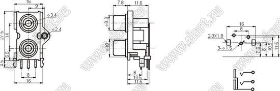 Каталог > Электронные компоненты, радиодетали > Разъёмы (соединители, переходники) > Разъемы аудио-видео > Разъемы RCA («тюльпан») > гнезда RCA > Блоки по два гнезда серии RCA "тюльпан" > RCA-209