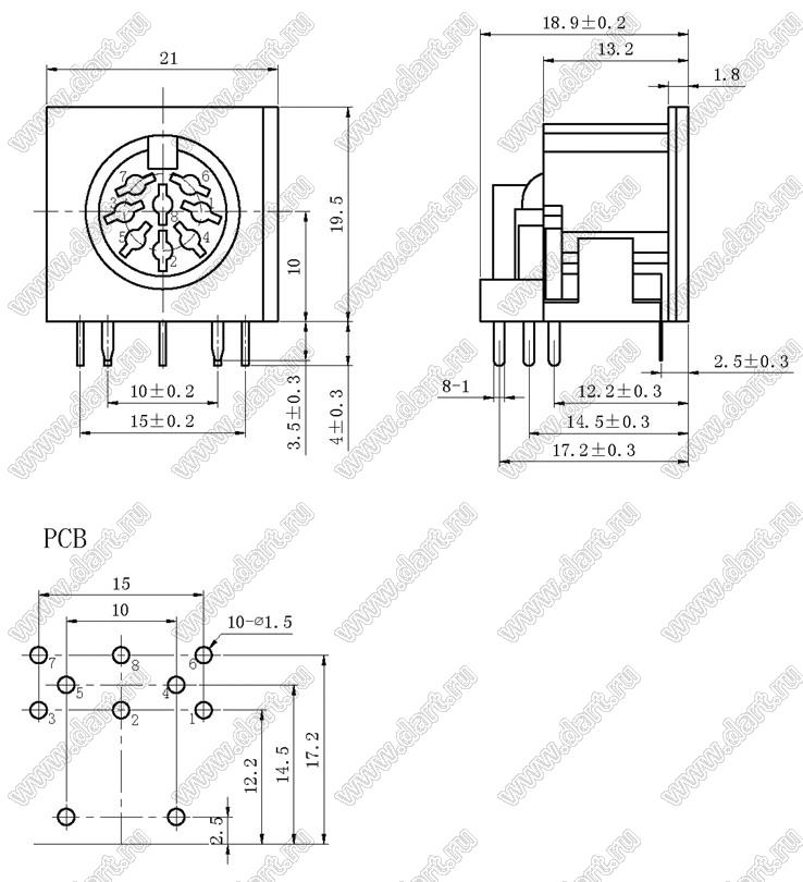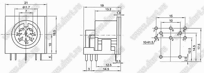 Каталог > Электронные компоненты, радиодетали > Разъёмы (соединители, переходники) > Разъемы DIN круглые > Розетки DIN на плату > DS-8-03 (62PC8FS)