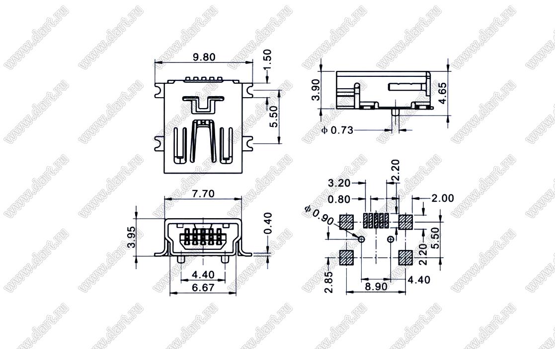 Розетка мини USB2.0 для поверхностного (SMD) монтажа, 5 конт., (0.4)