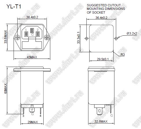 Каталог > Электронные компоненты, радиодетали > Разъёмы (соединители, переходники) > Разъемы AC (разъемы сетевого питания) > Однофазные входные гнезда с фильтром от помех > YL01T1