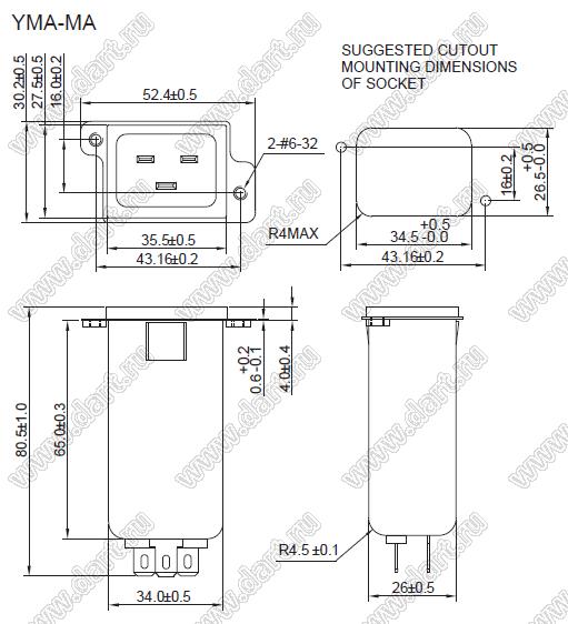 Каталог > Электронные компоненты, радиодетали > Разъёмы (соединители, переходники) > Разъемы AC (разъемы сетевого питания) > Однофазные входные гнезда с фильтром от помех > YMA20A1-MA