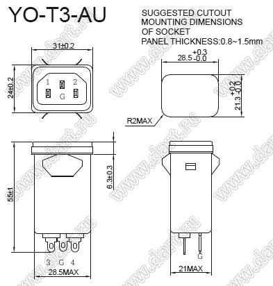 Каталог > Электронные компоненты, радиодетали > Разъёмы (соединители, переходники) > Разъемы AC (разъемы сетевого питания) > Однофазные входные гнезда с фильтром от помех > YO06T3-AU