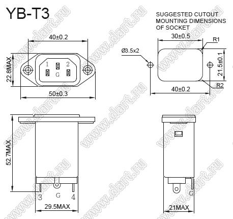 Каталог > Электронные компоненты, радиодетали > Разъёмы (соединители, переходники) > Разъемы AC (разъемы сетевого питания) > Однофазные входные гнезда с фильтром от помех > YB01T3