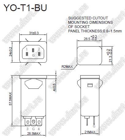 Каталог > Электронные компоненты, радиодетали > Разъёмы (соединители, переходники) > Разъемы AC (разъемы сетевого питания) > Однофазные входные гнезда с фильтром от помех > YO01T1-BU