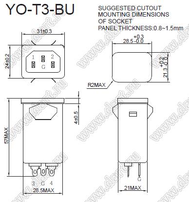 Каталог > Электронные компоненты, радиодетали > Разъёмы (соединители, переходники) > Разъемы AC (разъемы сетевого питания) > Однофазные входные гнезда с фильтром от помех > YO15T3-BU