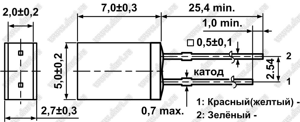 Каталог > Оптоэлектроника и индикация > Светодиоды и изделия на светодиодах > Светодиоды выводные > Светодиоды двухцветные прямоугольные 2x5x7 мм > DR2-31OG