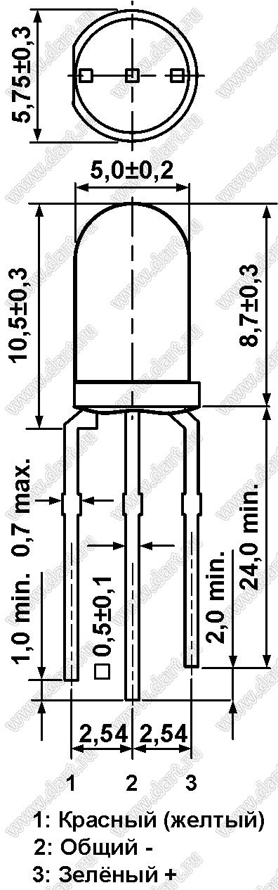 Светодиод двухцветный 5 мм; красный/желто-зеленый; 644/568нм; корпус диффузный; 2,0…2,2/2,3…2,5V; 85…95/20…30мКд; 68…95°; общий катод (ОК)