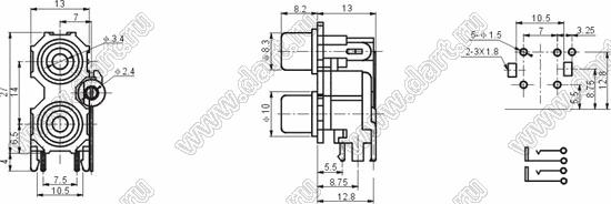 Каталог > Электронные компоненты, радиодетали > Разъёмы (соединители, переходники) > Разъемы аудио-видео > Разъемы RCA («тюльпан») > гнезда RCA > Блоки по два гнезда серии RCA "тюльпан" > RCA-213F