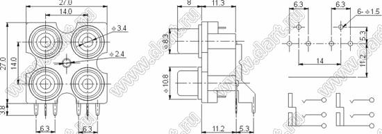 Каталог > Электронные компоненты, радиодетали > Разъёмы (соединители, переходники) > Разъемы аудио-видео > Разъемы RCA («тюльпан») > гнезда RCA > Блоки по четыре гнезда серии RCA "тюльпан" > RCA-407P
