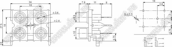 Каталог > Электронные компоненты, радиодетали > Разъёмы (соединители, переходники) > Разъемы аудио-видео > Разъемы RCA («тюльпан») > гнезда RCA > Блоки по четыре гнезда серии RCA "тюльпан" > RCA-408B