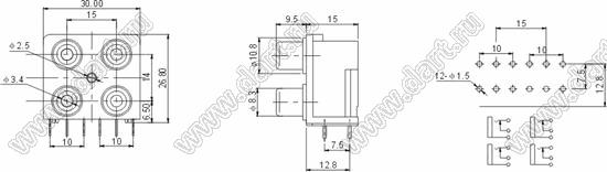 Каталог > Электронные компоненты, радиодетали > Разъёмы (соединители, переходники) > Разъемы аудио-видео > Разъемы RCA («тюльпан») > гнезда RCA > Блоки по четыре гнезда серии RCA "тюльпан" > RCA-418