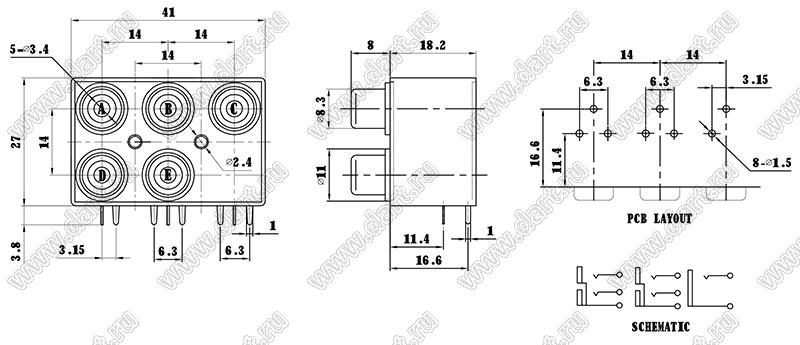 Каталог > Электронные компоненты, радиодетали > Разъёмы (соединители, переходники) > Разъемы аудио-видео > Разъемы RCA («тюльпан») > гнезда RCA > Блоки по пять гнезд серии RCA "тюльпан" > RCA-507-FB
