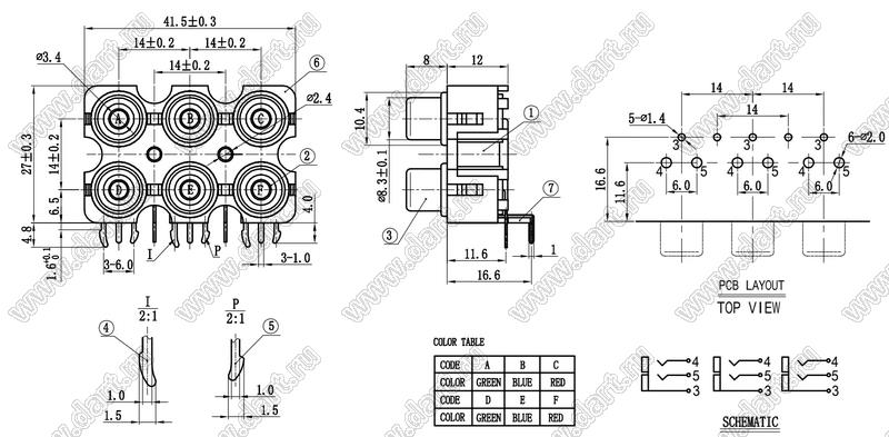 Каталог > Электронные компоненты, радиодетали > Разъёмы (соединители, переходники) > Разъемы аудио-видео > Разъемы RCA («тюльпан») > гнезда RCA > Блоки по шесть гнезд серии RCA "тюльпан" > RCA-606E