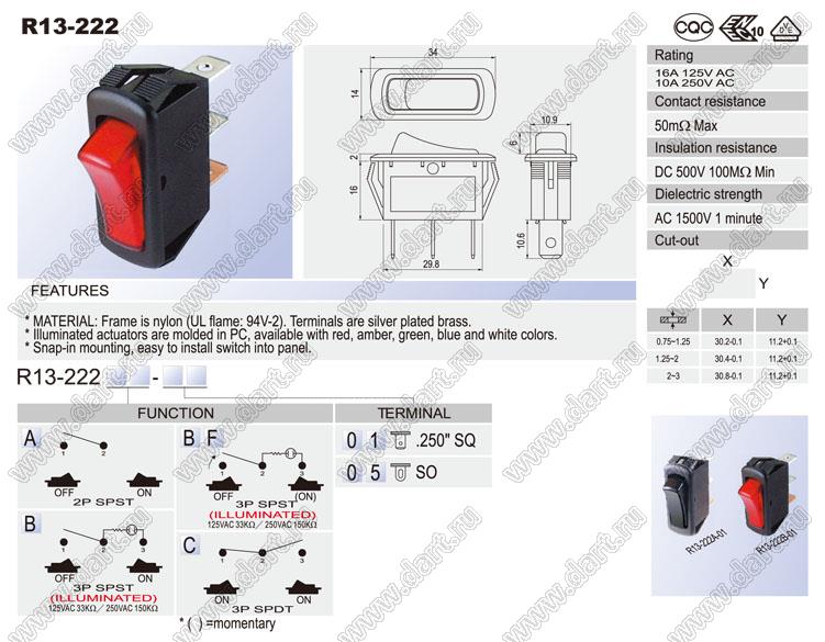 Каталог > Электронные компоненты, радиодетали > Переключатели, кнопки > Переключатели клавишные (ROCKER) > R13 серия > R13-222 серия > R13-222B-01-G
