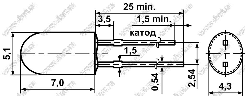 Каталог > Оптоэлектроника и индикация > Светодиоды и изделия на светодиодах > Светодиоды выводные > Светодиоды овальные 5,1х4,3 мм > DY-5234SEG3DC