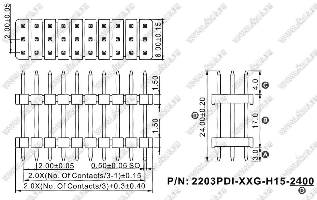 Каталог > Электронные компоненты, радиодетали > Разъёмы (соединители, переходники) > Разъемы плата-плата (межплатные) > шаг 2,00x2,00 мм (разъемы межплатные штыревые и гнезда для них) > трехрядные > 2203PDI-XXG-H15-2660 серия > 2203PDI-060G-H15-2400