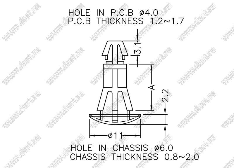 Каталог > Фурнитура для электронных устройств > Фиксаторы плат, стойки межплатные > Фиксаторы под круглое отверстие > Фиксаторы с двумя защелками > RCF серия > RCF-5B