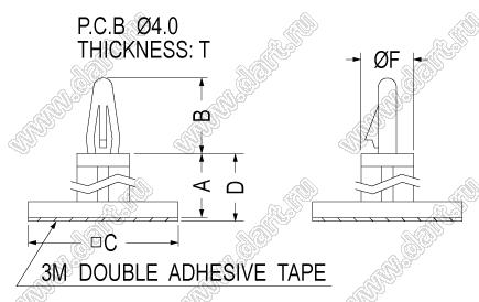 Фиксатор платы с защелкой на самоклеящейся площадке 18x18 мм; A=11,8мм; B=10,2мм; T=1,2...1,6мм; dп=4,0мм; нейлон-66 (UL); натуральный