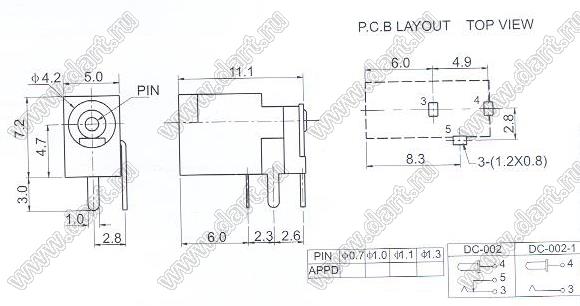 Каталог > Электронные компоненты, радиодетали > Разъёмы (соединители, переходники) > Разъемы вторичного (низковольтного) DC питания > DC гнезда (вторичного низковольтного питания) > DC-002-1.3 (DC-313 JACK, DJK-05D)