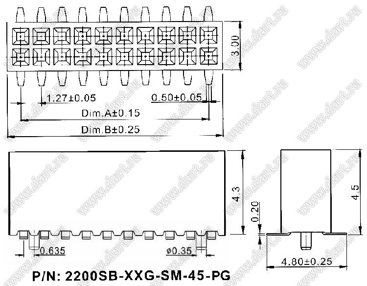 Каталог > Электронные компоненты, радиодетали > Разъёмы (соединители, переходники) > Разъемы плата-плата (межплатные) > шаг 1,27x1,27 мм (разъемы межплатные штыревые и гнезда для них) > двухрядные > 2200SB-XXXG-SM-45-PG серия > 2200SB-060G-SM-45-PG