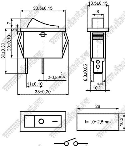 Переключатель клавишный ON-OFF; 30,5х13,5мм; 15A/30A 250VAC; толкатель белый/корпус белый; без подсветки; маркировка "O I"; терминалы 6,3x0,8мм