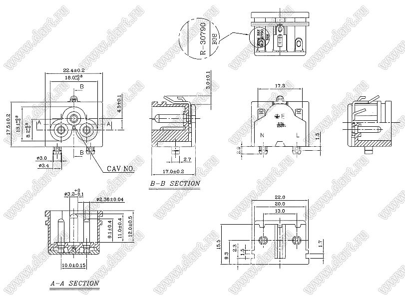 Каталог > Электронные компоненты, радиодетали > Разъёмы (соединители, переходники) > Разъемы AC (разъемы сетевого питания) > Трехполюсные разъемы сетевого питания > IEC 60320 C5/C6 > R-30790(B08)