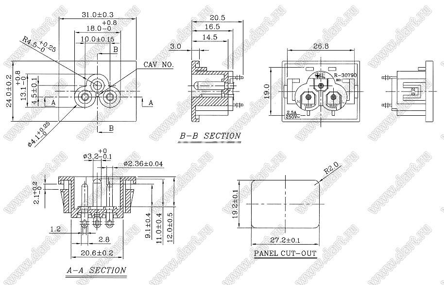Каталог > Электронные компоненты, радиодетали > Разъёмы (соединители, переходники) > Разъемы AC (разъемы сетевого питания) > Трехполюсные разъемы сетевого питания > IEC 60320 C5/C6 > R-30790(B07)