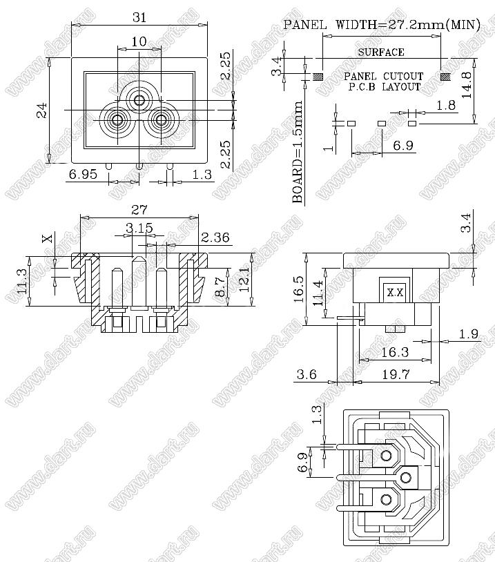 Каталог > Электронные компоненты, радиодетали > Разъёмы (соединители, переходники) > Разъемы AC (разъемы сетевого питания) > Трехполюсные разъемы сетевого питания > IEC 60320 C5/C6 > JR-307SB1(PCB)(SNAP-IN TYPE)