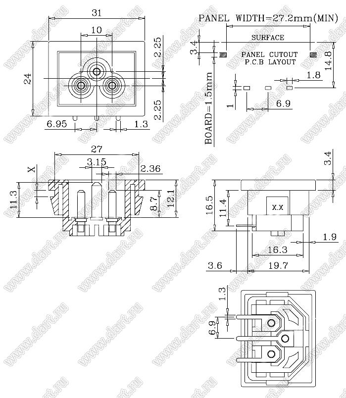 Каталог > Электронные компоненты, радиодетали > Разъёмы (соединители, переходники) > Разъемы AC (разъемы сетевого питания) > Трехполюсные разъемы сетевого питания > IEC 60320 C5/C6 > JR-307SB(PCB)