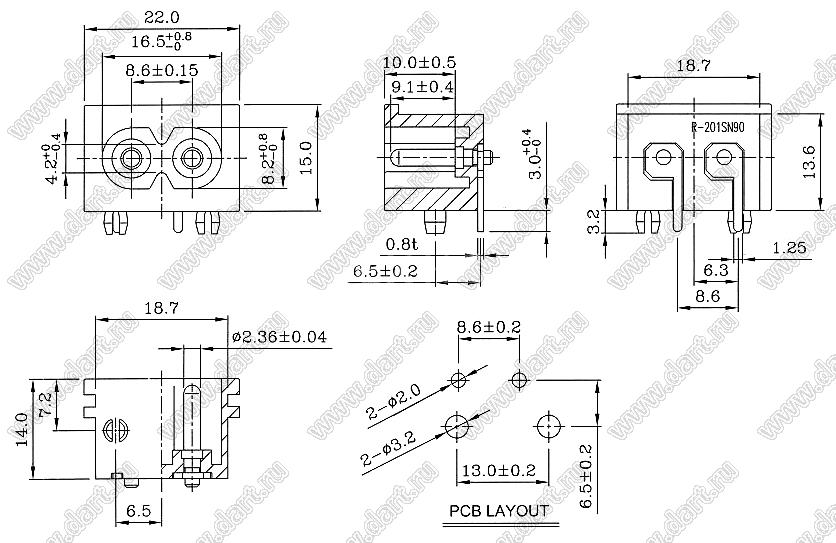 Каталог > Электронные компоненты, радиодетали > Разъёмы (соединители, переходники) > Разъемы AC (разъемы сетевого питания) > Двухполюсные разъемы сетевого питания > IEC 60320 C7/C8 > R-201SN90(C08)