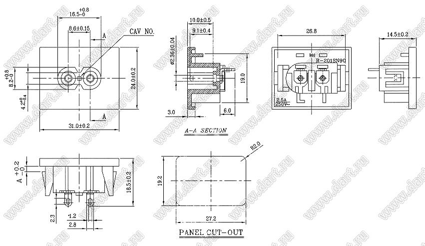 Каталог > Электронные компоненты, радиодетали > Разъёмы (соединители, переходники) > Разъемы AC (разъемы сетевого питания) > Двухполюсные разъемы сетевого питания > IEC 60320 C7/C8 > R-201SN90(B03)