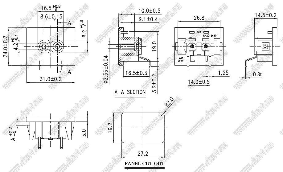 Каталог > Электронные компоненты, радиодетали > Разъёмы (соединители, переходники) > Разъемы AC (разъемы сетевого питания) > Двухполюсные разъемы сетевого питания > IEC 60320 C7/C8 > R-201SN90(B02)