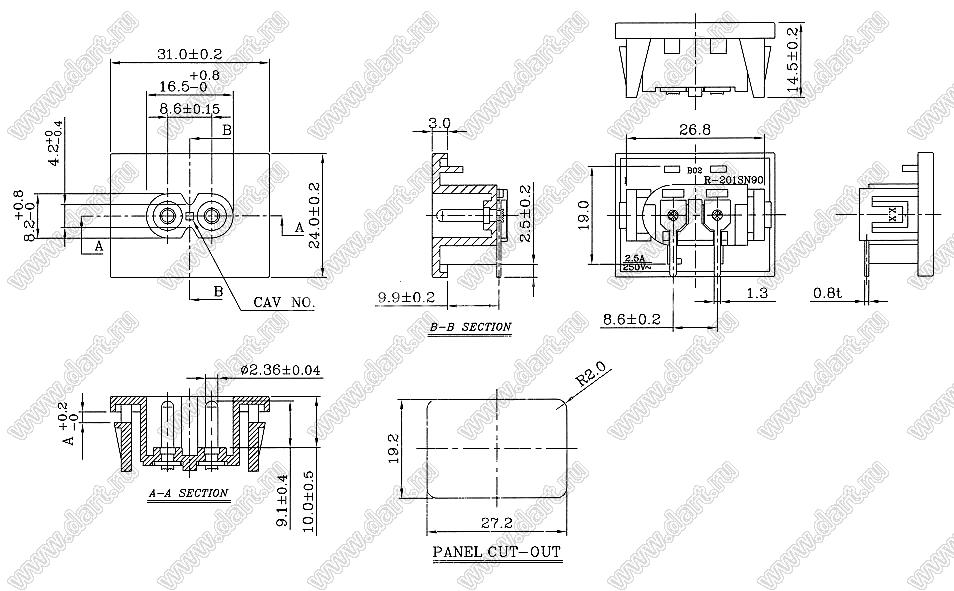 Каталог > Электронные компоненты, радиодетали > Разъёмы (соединители, переходники) > Разъемы AC (разъемы сетевого питания) > Двухполюсные разъемы сетевого питания > IEC 60320 C7/C8 > R-201SN90(B00)