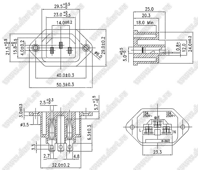 Каталог > Электронные компоненты, радиодетали > Разъёмы (соединители, переходники) > Разъемы AC (разъемы сетевого питания) > Трехполюсные разъемы сетевого питания > IEC 60320 C13/C14 > R-302(B00)